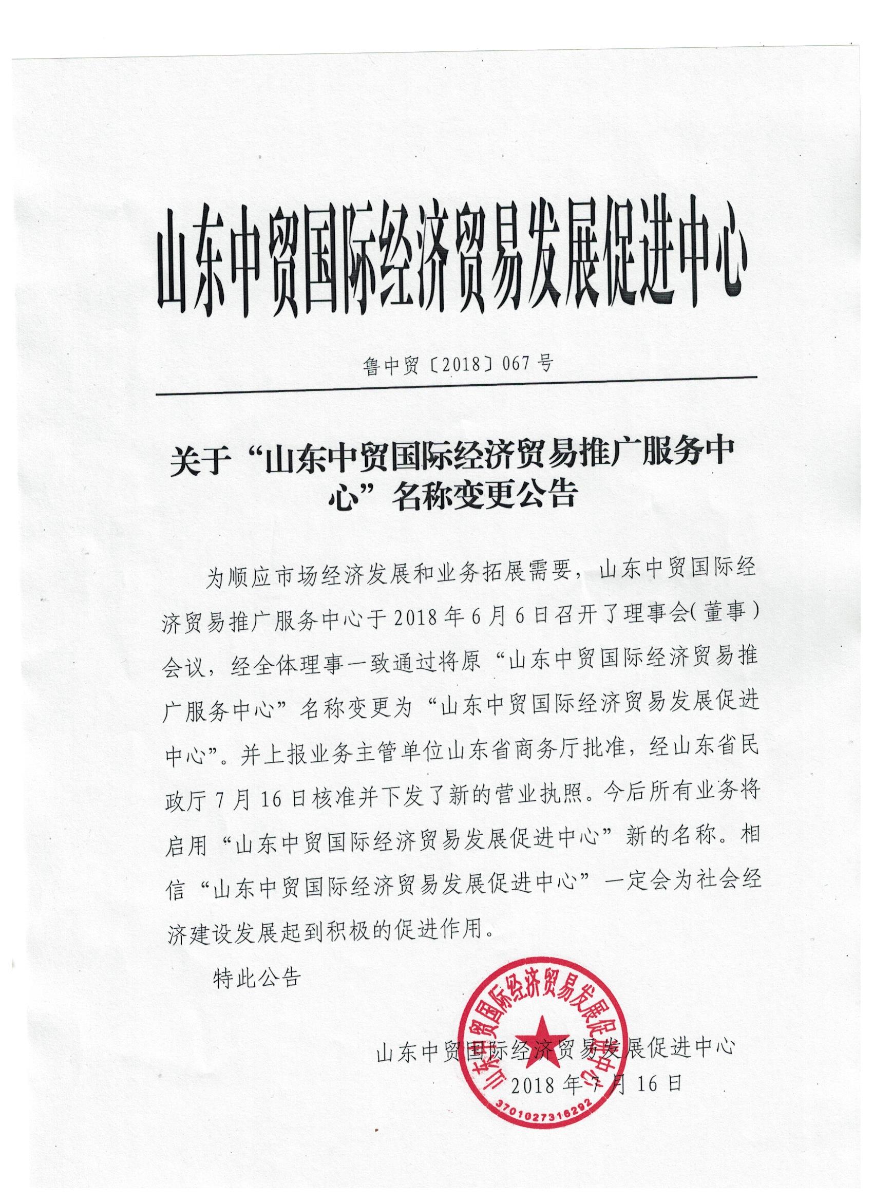關于“山東中貿(mào)國際經(jīng)濟貿(mào)易推廣服務中心”名稱變更公告